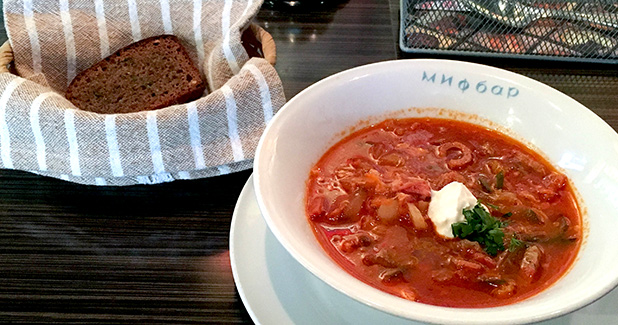 サラダは、酸味のあるさっぱりしたドレッシングがかかり、胃を刺激してくれます。トマトのスープは野菜とハムがたっぷりで、複雑かつ濃厚な味わいです。黒パンは、独特の酸味が哀調のあるロシアの荒野を彷彿とさせました。